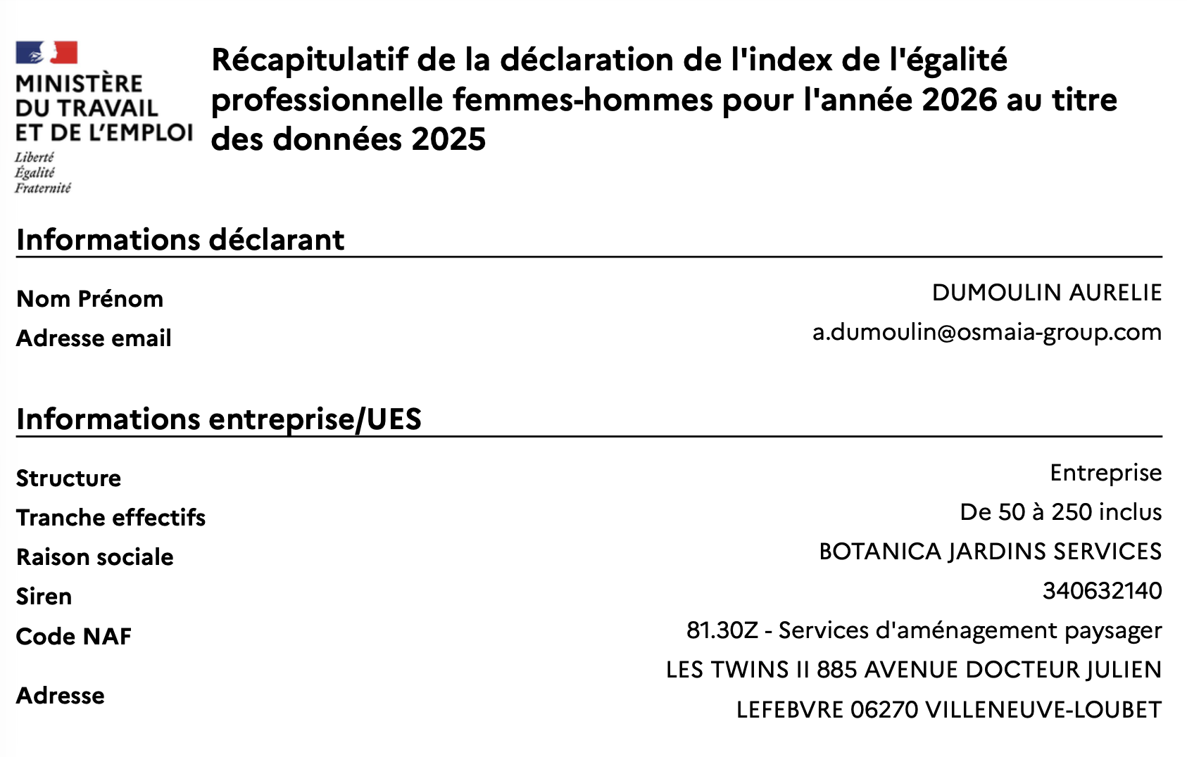 Déclaration de l'index de l'égalité professionnelle BOTANICA 2025